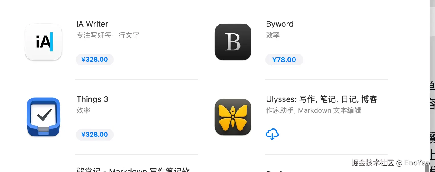 目前市面上主流的 markdown 本地编辑软件,主要是靠买断付费,市面上大部分的 markdown 编辑软件,严格意义上来说不算我们的竞品,markdown 面对的用户并不只是技术宅,而是广义上的互联网写作者,他们没有那么在乎 word 的各种高级编辑格式,他们在乎的是: 1. 方便的信息收集 2. 流畅的编辑体验 3. 自由的知识分享 4. 安全的信息备份