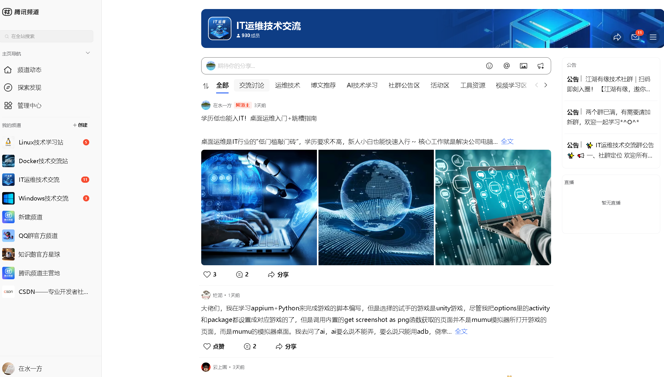 此外,我在 腾讯频道「IT运维技术交流」 的运营也进入第二个年头。2025年是投入最深的一年------我坚持高频发布技术科普、实战案例与学习资源,主动引导新人入门,营造积极互助的氛围。目前频道成员已接近 1,000人,正朝着千人技术社群稳步迈进。