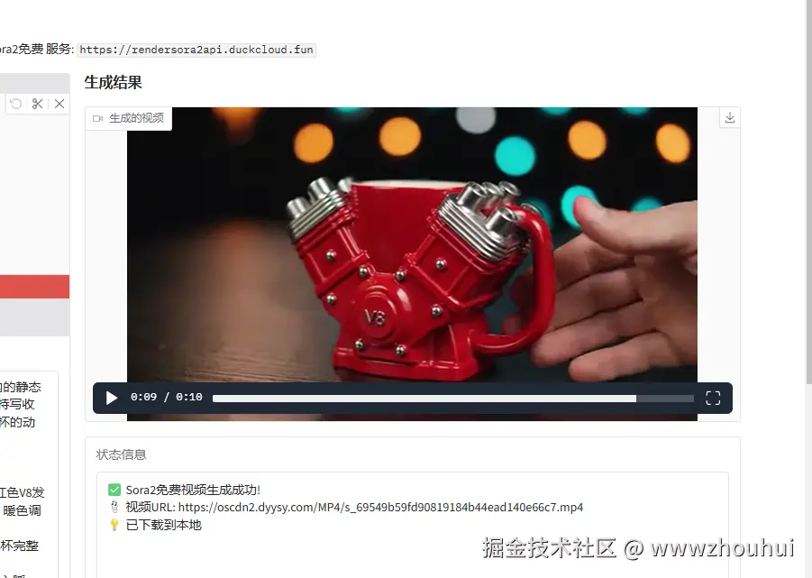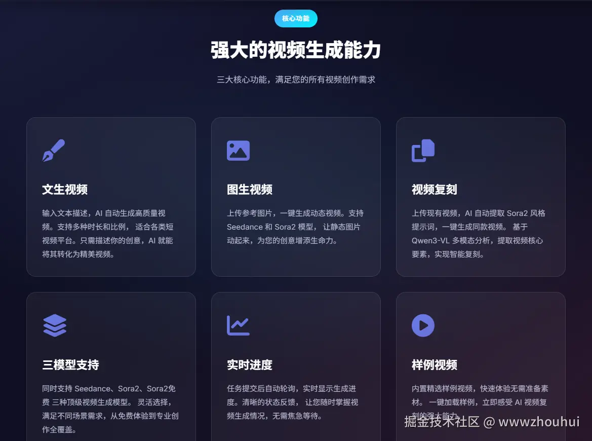 通过这套实践方案,内容创作者能够高效突破传统视频制作的痛点------借助一键部署(包括环境配置、依赖安装、API Key配置),无需专业的视频剪辑技能和昂贵的设备投入,就能快速生成Sora2级别的AI视频(如本次演示的"视频复刻"功能)。无论是文生视频、图生视频,还是视频提示词提取、一键复刻同款,都能通过简单的Web界面操作完成,极大提升创作效率和内容产出速度。