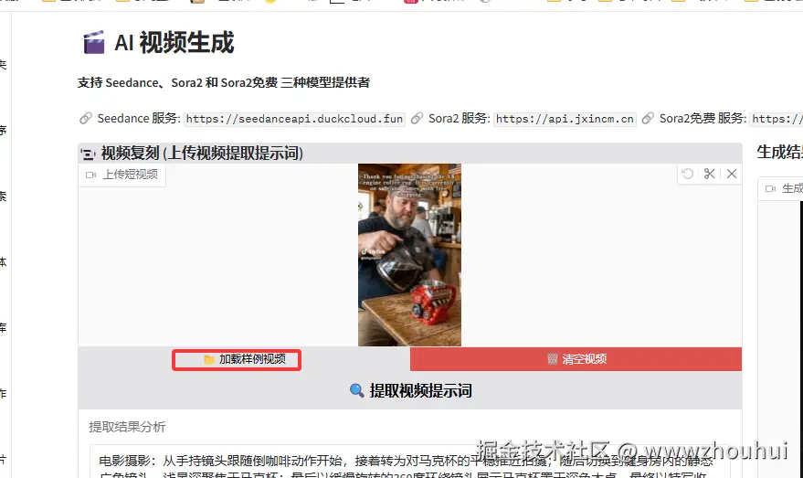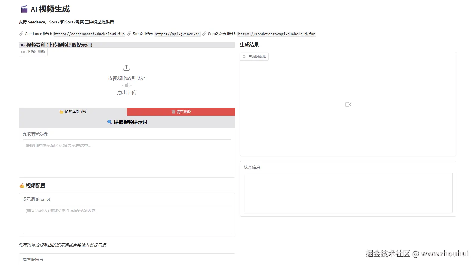 AI-video-Replicate 是一款开源的AI视频生成与复刻工具,支持 Seedance 、Sora2 和 Sora2免费 三种主流模型提供者,提供文生视频、图生视频和视频复刻三大核心功能。通过这个工具,我们可以轻松实现从文本描述生成视频、上传图片生成动态视频,以及最强大的------上传现有视频自动提取提示词一键复刻!