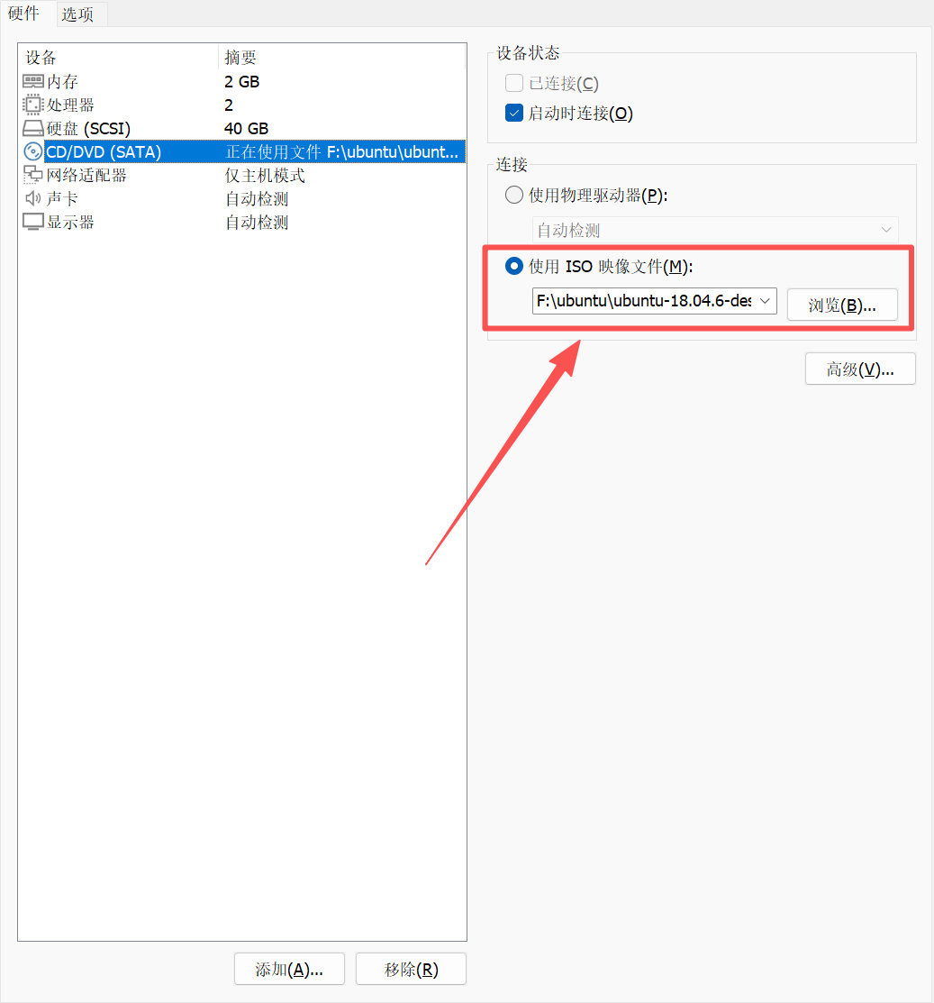 ⑩选择 新CD/DVD(SATA),然后选择 使用ISO镜像文件,点击浏览找到ubuntu18.04的镜像。