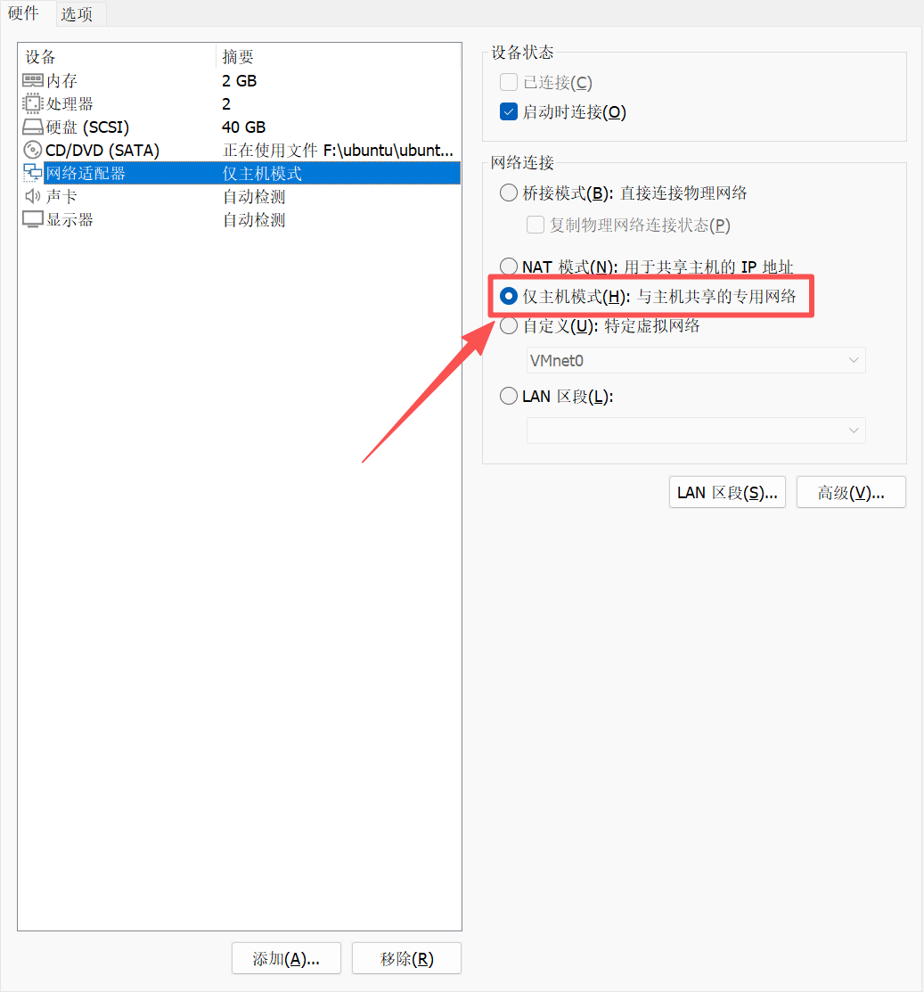 11 点击 网络适配器,网络连接选择 仅主机模式:与主机共享的专用网络