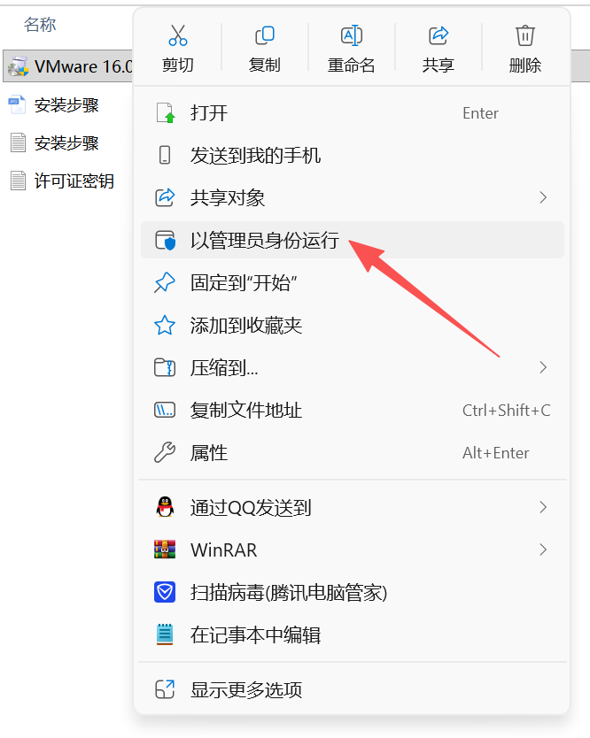 ②鼠标右击 VMware 16.0.0,选择管理员身份进行运行。