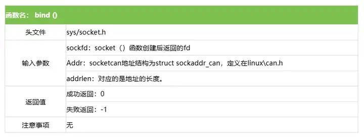 bind(fd, (struct sockaddr *)&addr, sizeof(addr)); //将套接字与 can0 绑定