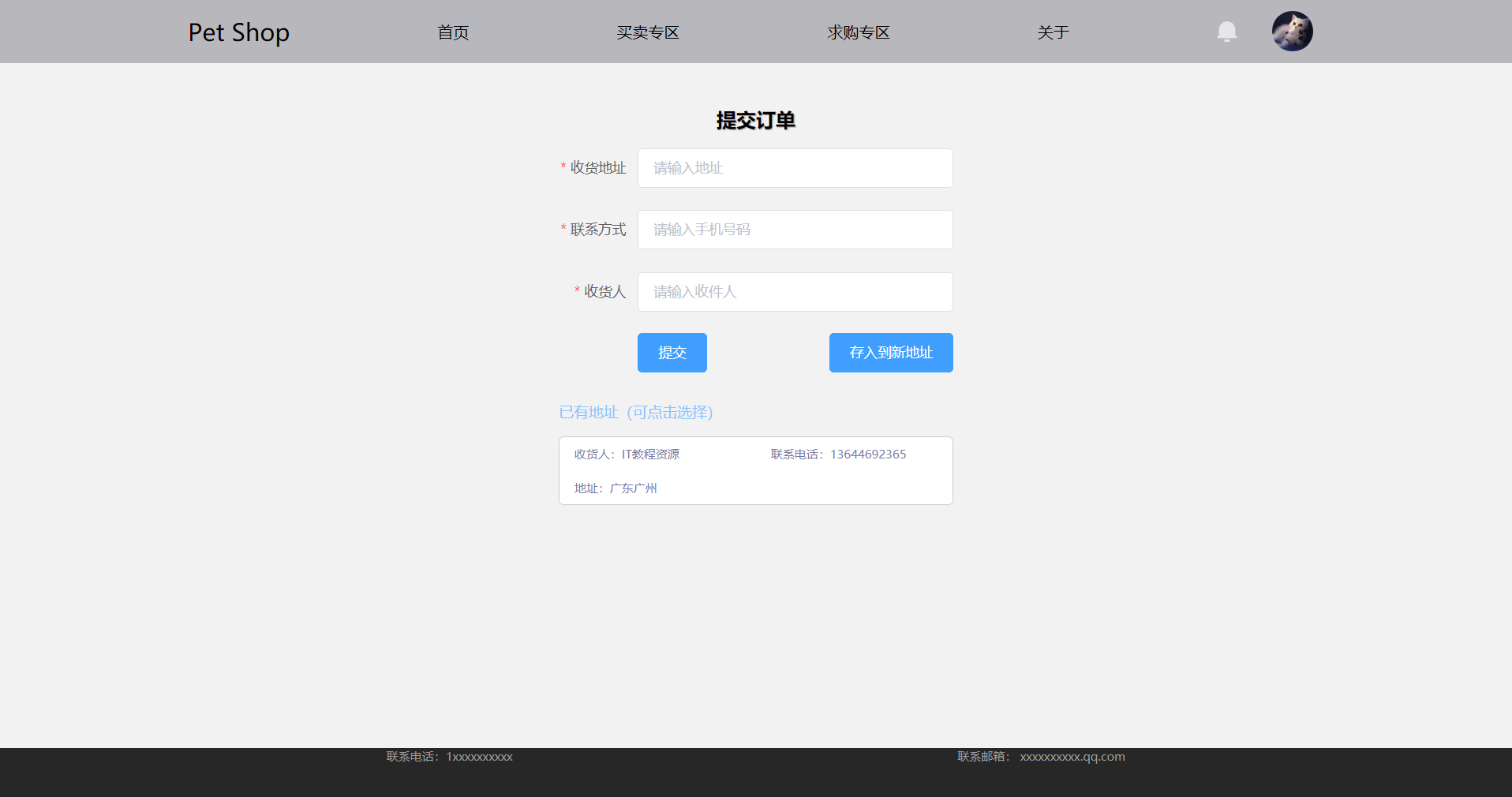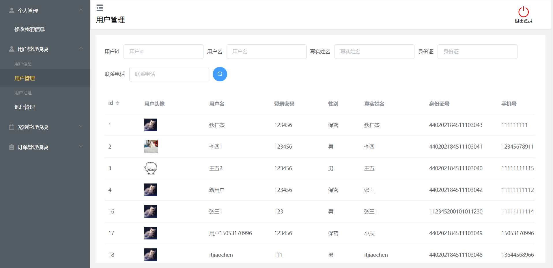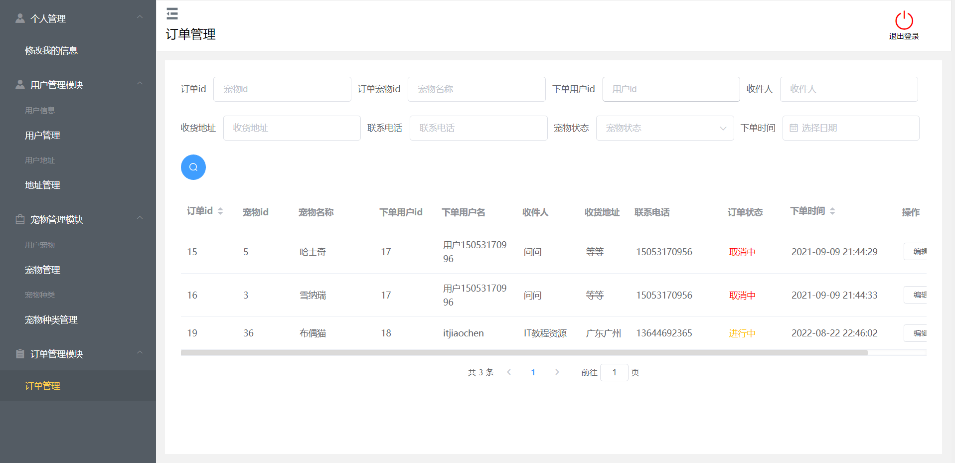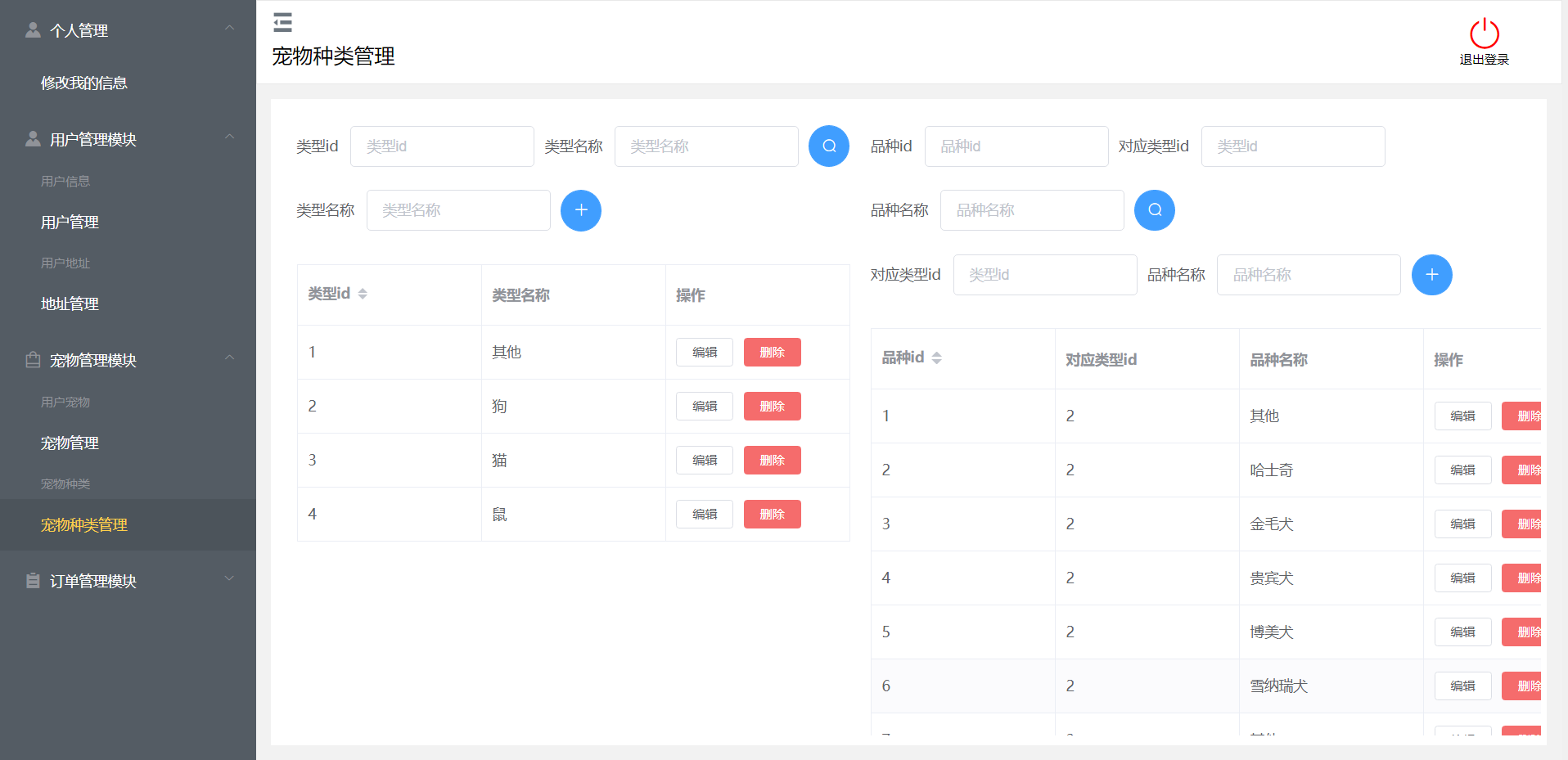 后台:登录、修改信息、用户管理、地址管理、宠物管理、宠物分类管理、订单管理、退出登录等