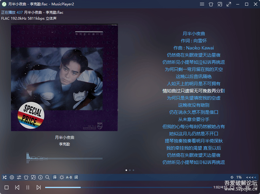Windows\] MusicPlayer2 V2.78 链接:[https://pan.xunlei.com/s/VOhndZkhaG1s-y4Lv-J0il7GA1?pwd=v6pr#](https://pan.xunlei.com/s/VOhndZkhaG1s-y4Lv-J0il7GA1?pwd=v6pr# "https://pan.xunlei.com/s/VOhndZkhaG1s-y4Lv-J0il7GA1?pwd=v6pr#")  MusicPlayer2是一款功能强大的本地音乐播放软件,旨在为用户提供最佳的本地音乐播放体验。它支持歌词显示、歌词卡拉OK样式显示、歌词在线下载、歌词编辑、歌曲标签识别、专辑封面显示、专辑封面在线下载、频谱分析、音效设置、任务栏缩略图按钮、主题颜色、格式转换等功能,支持高度自定义的界面布局,支持多种播放内核(BASS和FFMpeg)。播放器支持大部分常见的音频格式。