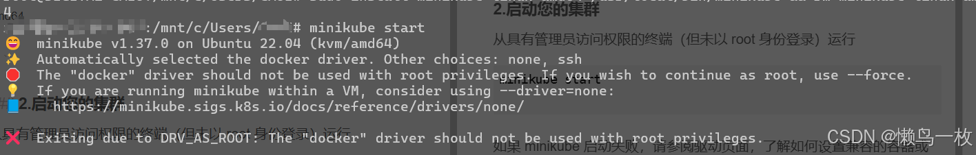 - Minikube 明确禁止在 root 下使用 Docker 驱动以防止潜在问题。