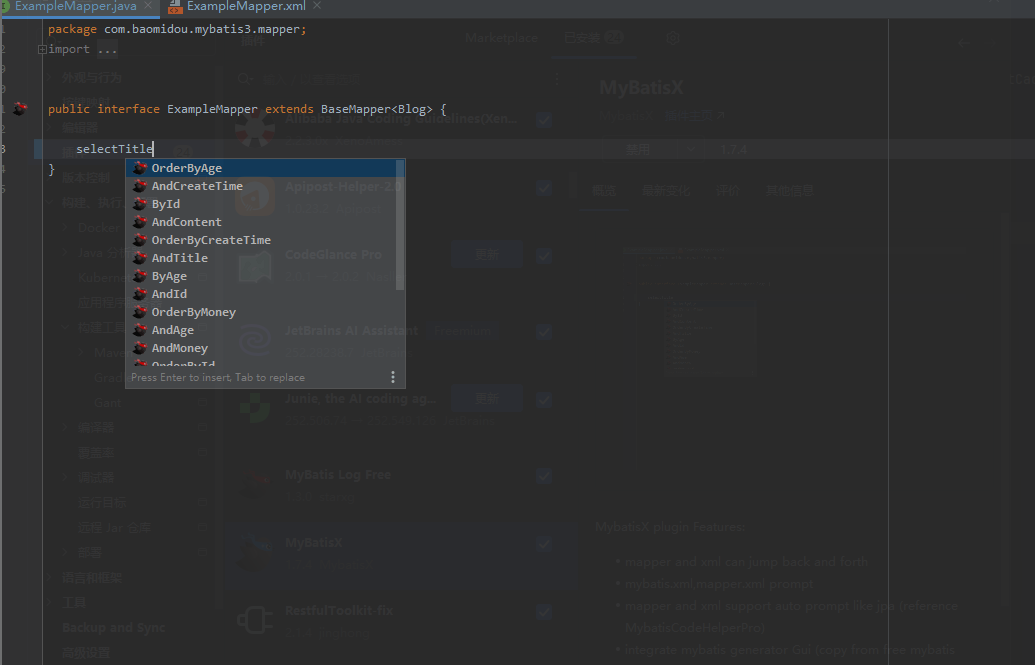 MyBatisX 是一款由 MyBatis-Plus 团队开发的 IntelliJ IDEA 插件,支持 Mapper 接口与 xml 文件之间的双向导航跳转,方便快速定位。