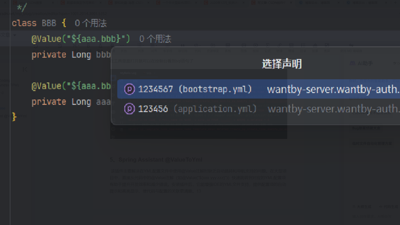该插件主要解决在YML配置文件中使用@Value注解时缺乏自动跳转和导航支持的问题。在大型项目中,直接从代码中的@Value注解(如@Value("${xxx.yyy.zzz}"))快速跳转到对应的YML配置项有助于提升开发效率和减少错误。安装插件后,它能增强IDE的YML文件支持,提供配置项的自动提示和高亮显示,使代码与配置的关联更清晰。