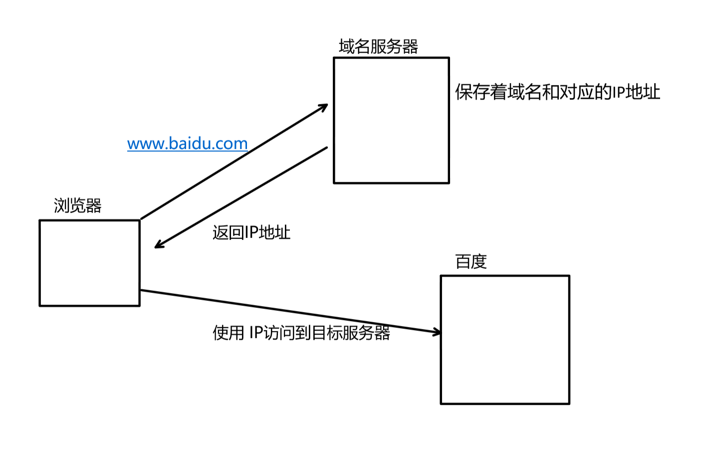 - 域名服务器是网络中的基础设施建设,内部保存着域名和对应的IP地址,当时使用浏览器访问百度时,浏览器内部一般内置了域名服务器的IP地址,比如8.8.8.8。通过域名服务器获取到IP地址,这个过程叫做 DNS 。最后进行对目标服务器的访问。
