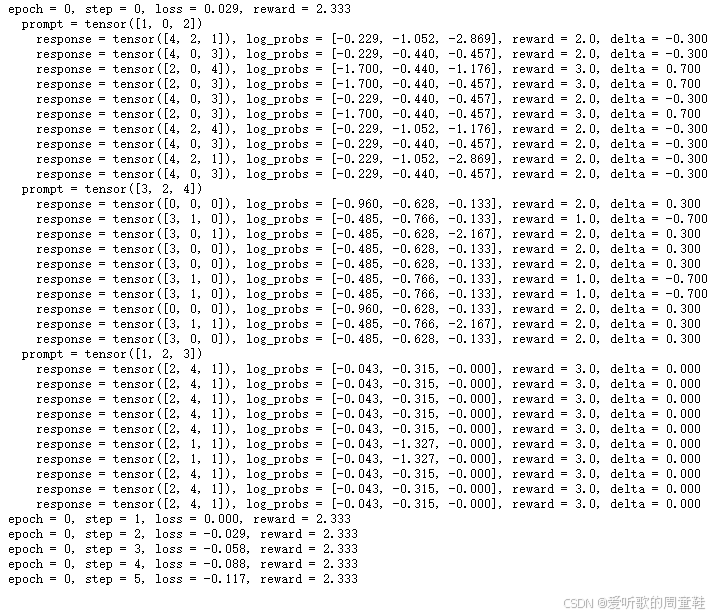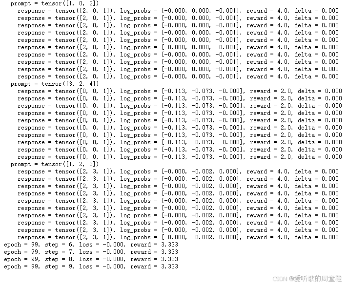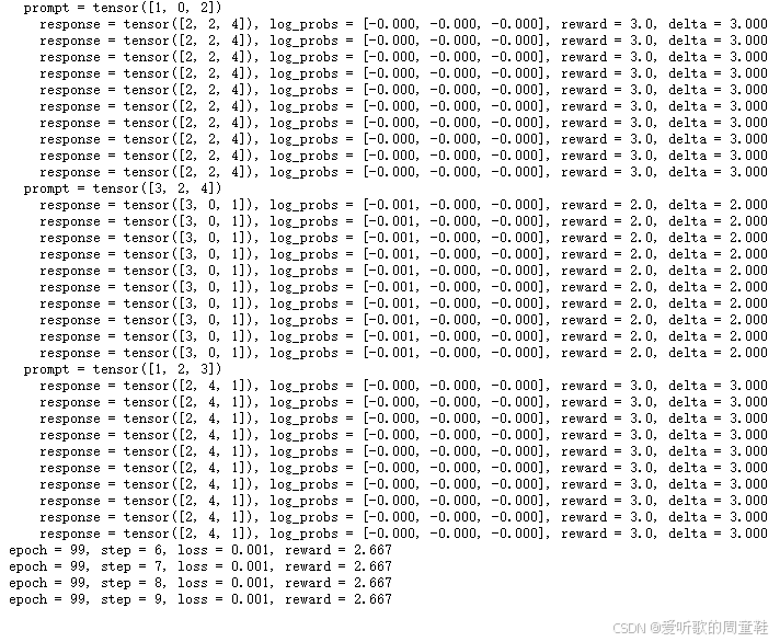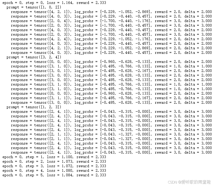 这里我们定义了一个简单的数据集,包含 3 个提示词(prompt),每个提示词长度为 3,接着定义模型、优化器,设置完成后就是多个循环结构和 GRPO 算法实现