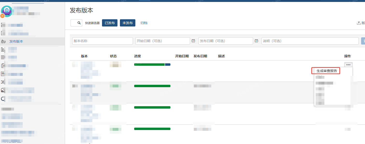 1:进入jira,进入项目主界面,点击【发布版本】,点击【生成审查报告】;