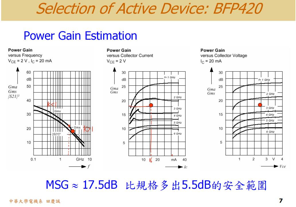 我们继续以 BFP420 晶体管为例进行分析。这款晶体管其实很适合1.8 GHz的应用,对于2.4 GHz频段也是可行的选择。它的特征频率(transition frequency) fTf_TfT 为 25 GHz。根据经验,晶体管在fTf_TfT/10(即2.5 GHz)的频率下通常仍能保持良好的性能。