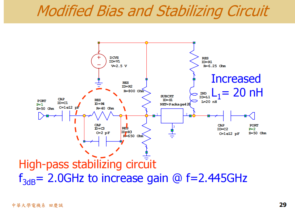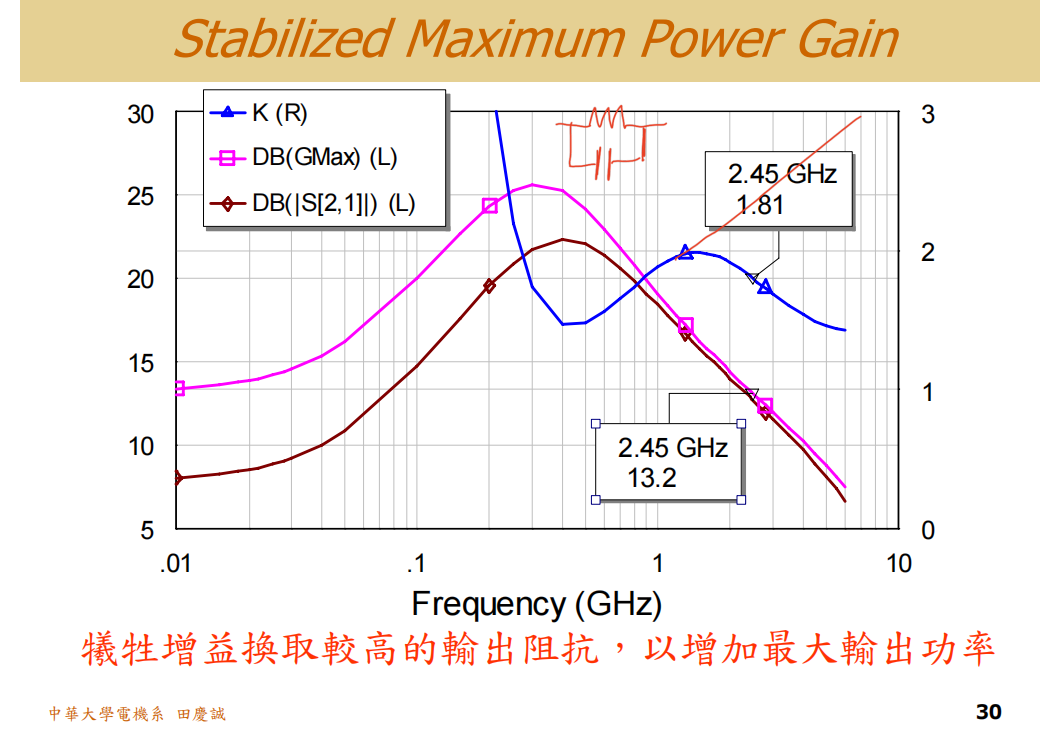 f = 1/(2πRC))呈现较低的阻抗。我们可以将这个频率设定在需要额外稳定性的频段(例如1-2GHz)。在该频段,射频信号会被这个电阻吸收掉,提升K值,确保稳定。而在2.4GHz的工作频段,该RC网络因电容阻抗很低,几乎被短路,对主电路性能影响极小。