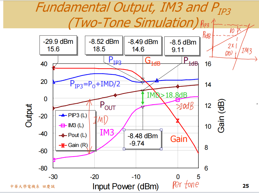 - 公式回顾 :OIP3 (dBm) = PoutP_{out}Pout (dBm) + ΔP/2,其中 PoutP_{out}Pout 是基波总输出功率,