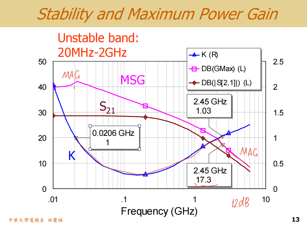 - 然而,在低频段(约20MHz至2GHz) ,K值小于1,电路潜在不稳定,可能发生低频振荡。这是许多射频放大器设计的通病,必须予以解决。