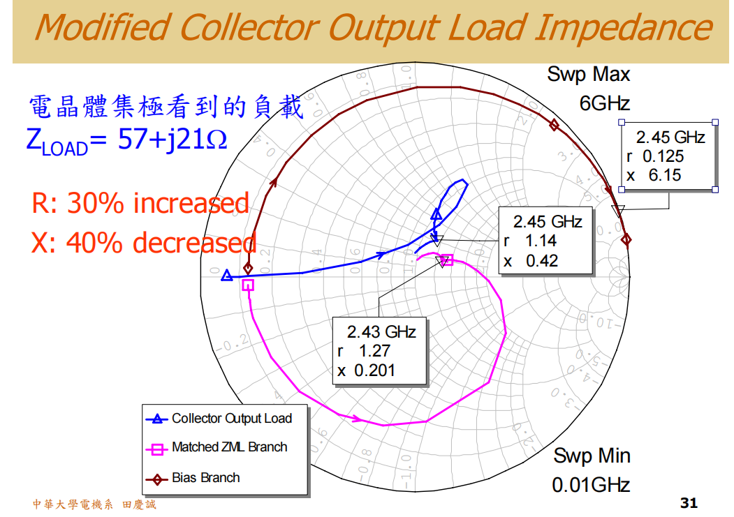 - 实际负载 :晶体管向外看,看到的不仅是匹配网络和50Ω负载,还包括了偏置/稳定网络 (那个3nH电感和6.25Ω电阻的并联组合)。这个并联路径在2.4GHz的阻抗很低,严重拉低了晶体管看到的总负载阻抗。我们估算的实际等效负载斜率对应的电阻远低于128Ω,大约在65Ω左右,且含有电抗成分。