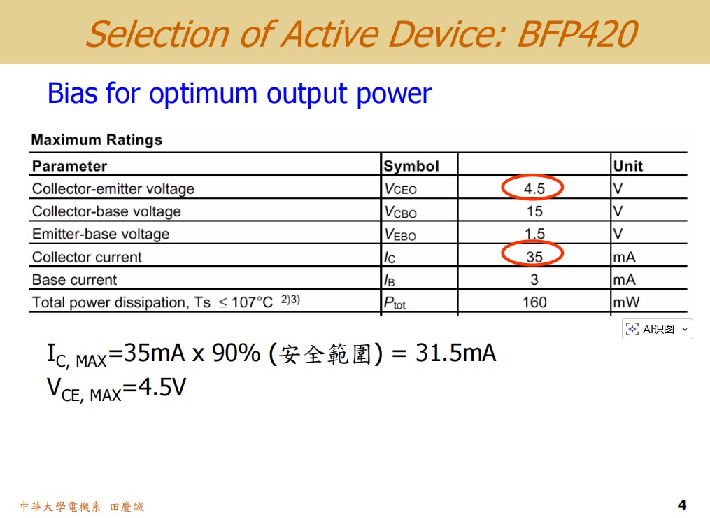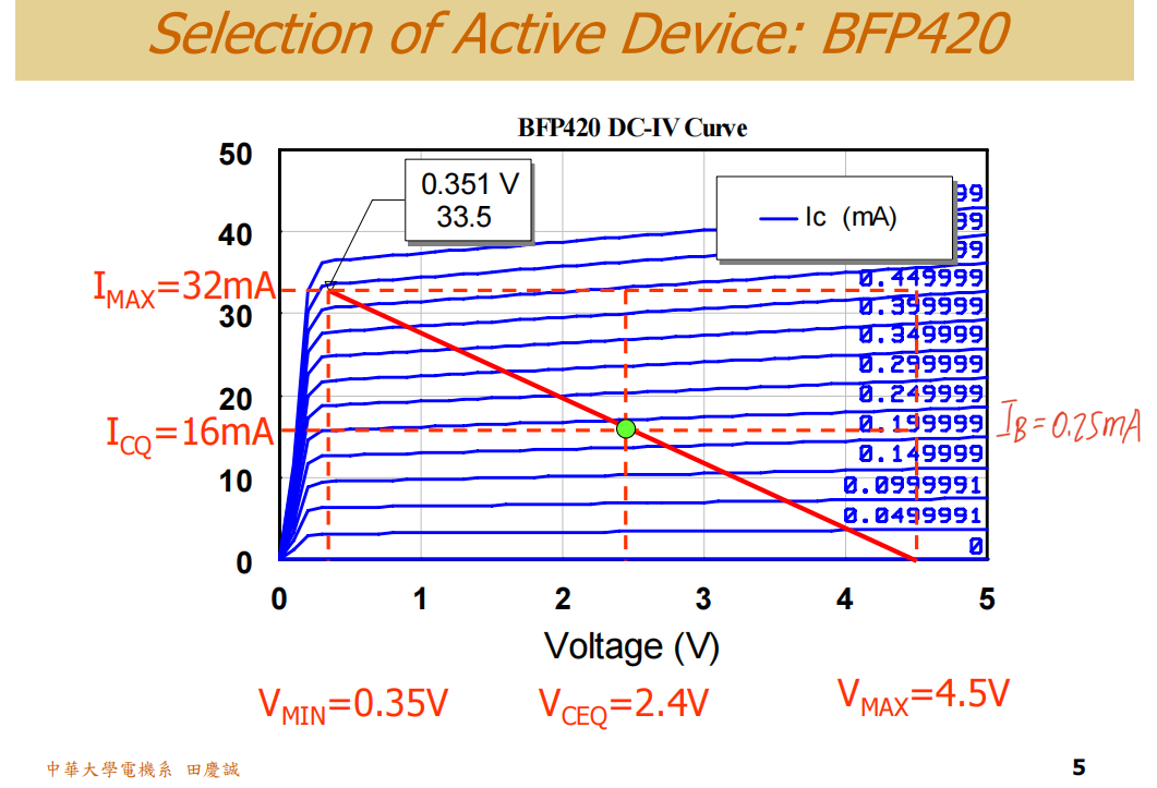 我们需要进行负载线分析(Load Line Analysis) ,检查在最大输出时,晶体管的瞬时工作点是否超出了其最大额定值 (如Vcemax=4.5V,Icmax=35mAVce_{max} = 4.5V, Ic_{max} = 35mAVcemax=4.5V,Icmax=35mA)。