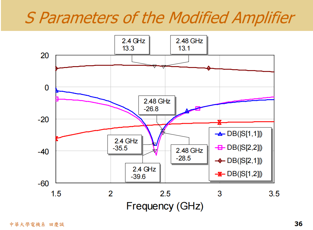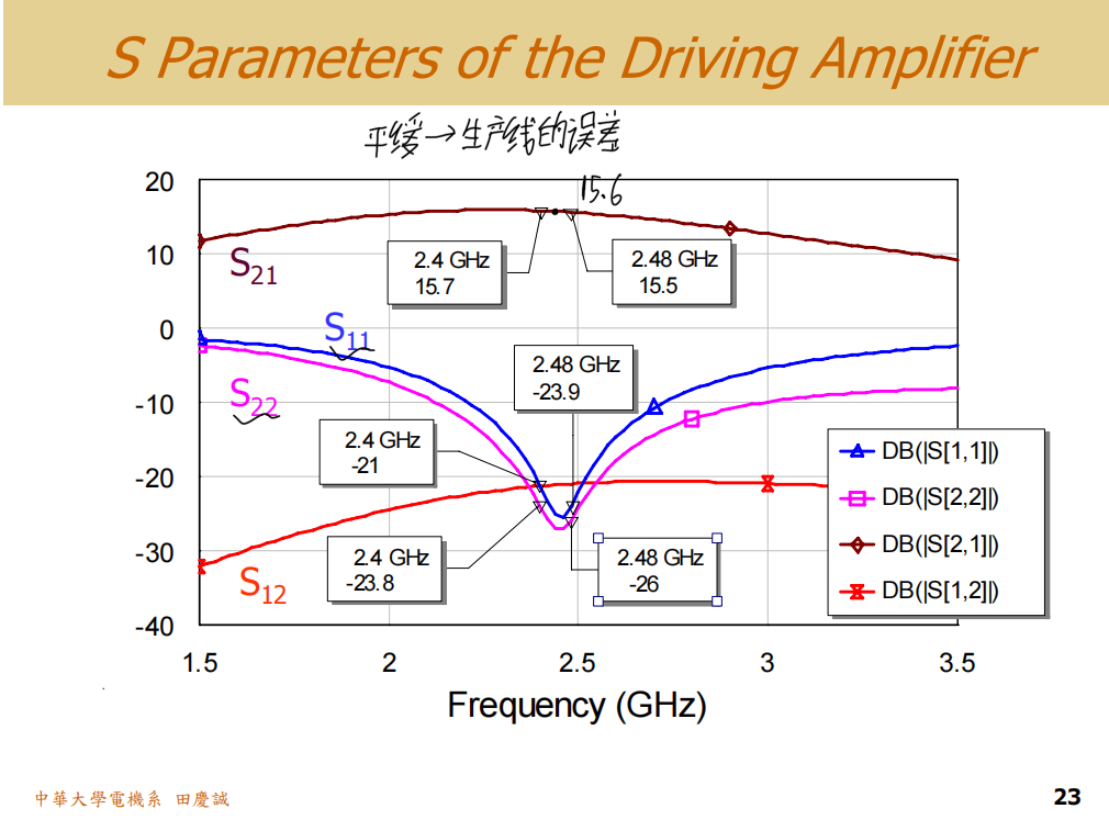 - 在 2.4GHz 处,最大可用增益从 17dB 下降到了约 15.6dB。