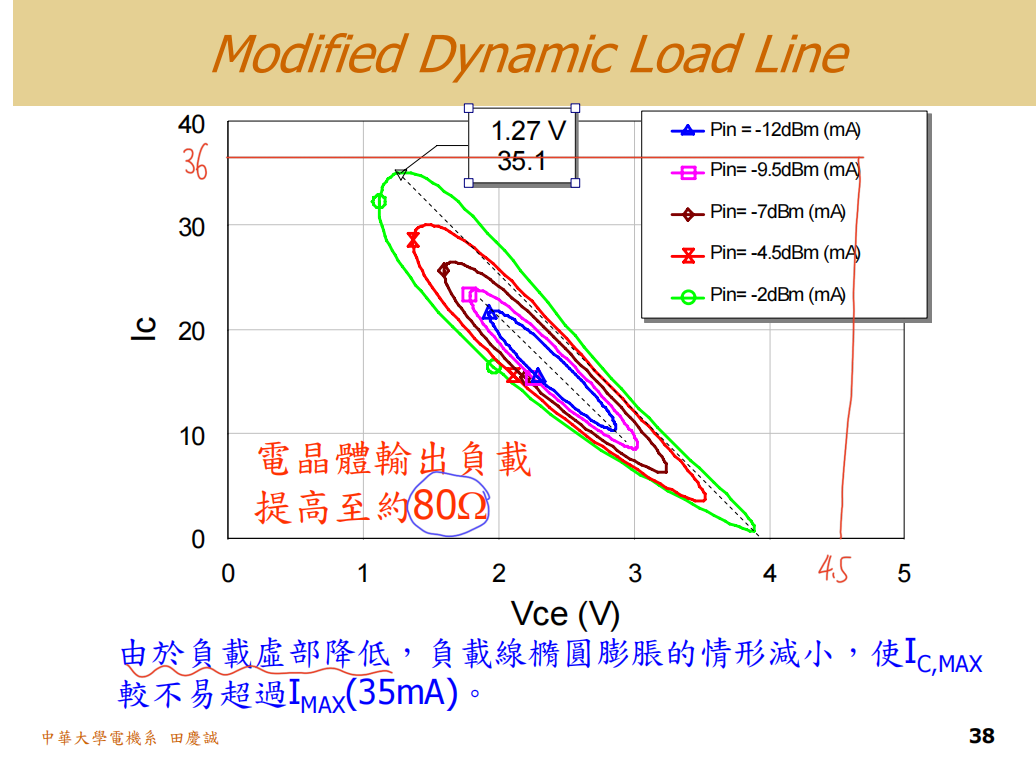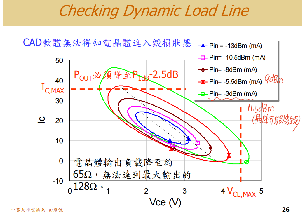 - 检查负载线 :通过绘制该输入功率下的负载线(即晶体管集电极电压和电流的瞬时轨迹),我们发现这条线(图中绿色的线)触及甚至超出了 由