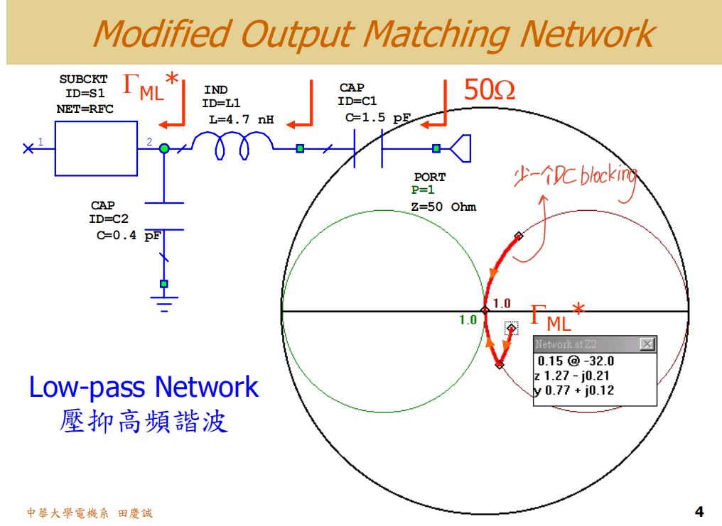 根据新的晶体管阻抗(因偏置网络改变而提升),我们重新设计了低通型(Low-Pass)的输入和输出匹配网络 ,以抑制谐波。