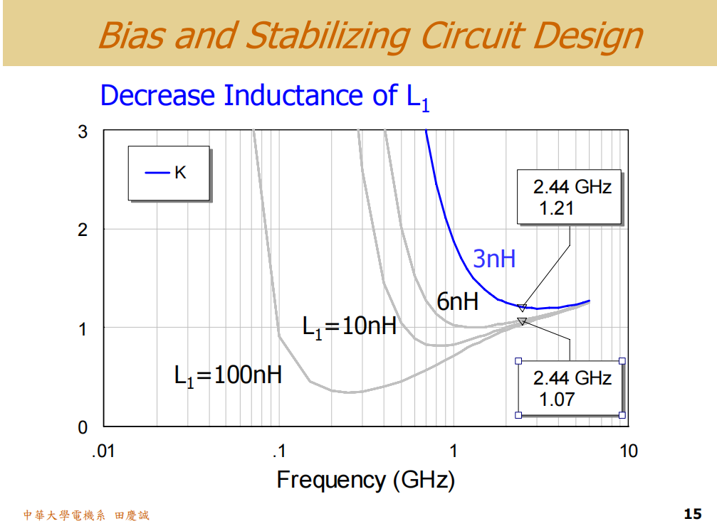 - 引发的新问题 :电感增大后,在较低频段(如几百MHz到2GHz) ,该支路阻抗会降低,可能导致电路在这些频段稳定性变差(K < 1),引发低频振荡。