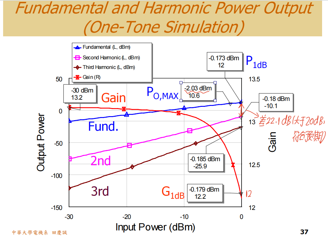 在增益从13.2dB压缩到12.2dB(即P1dB点)时,对应的输出功率是10.1dBm(与理论值12dBm有差距,实际仿真总会略差一些)。