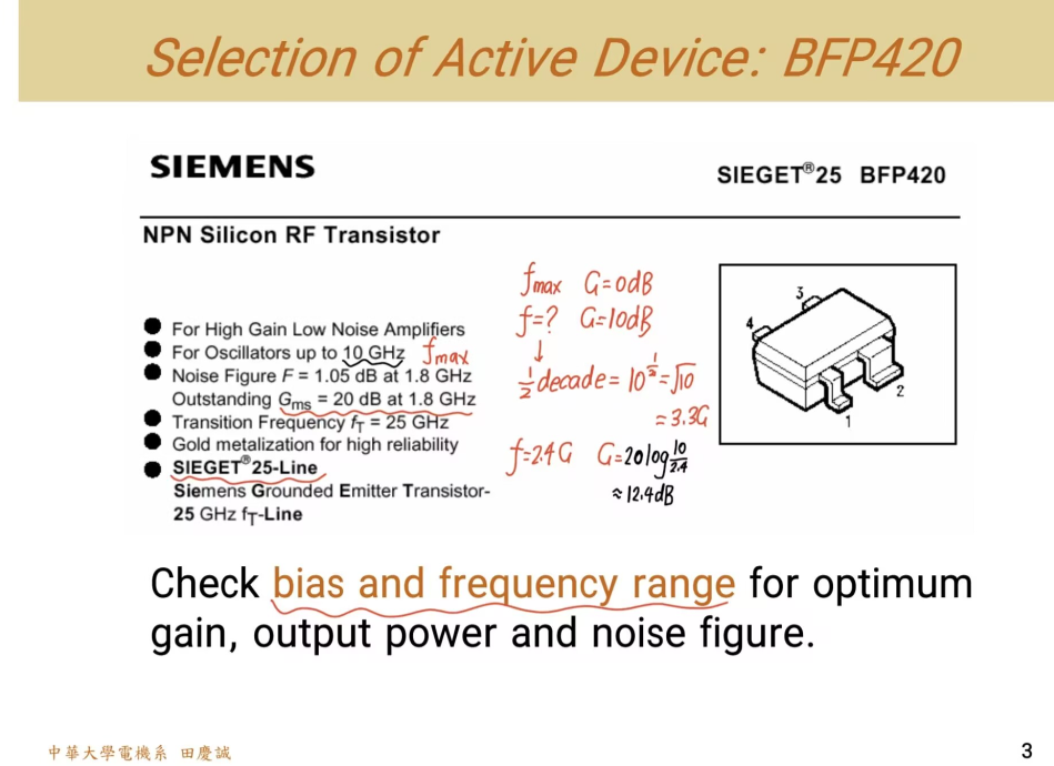 从它的参数来看,其振荡频率可达 10 GHz(for oscillators up to 10GHz)(这接近其 fmaxf_{max}fmax)。我们可以快速估算一下它在2.4 GHz下的增益:增益随频率的下降斜率通常是每十倍频程 20 dB。已知在 10 GHz 时增益约为 0 dB,那么通过计算 10 GHz 与 2.4 GHz 的比值,并换算成对数关系,可以估算出在 2.4 GHz 时其潜在增益仍有约十几dB(12.4dB),符合我们的需求。