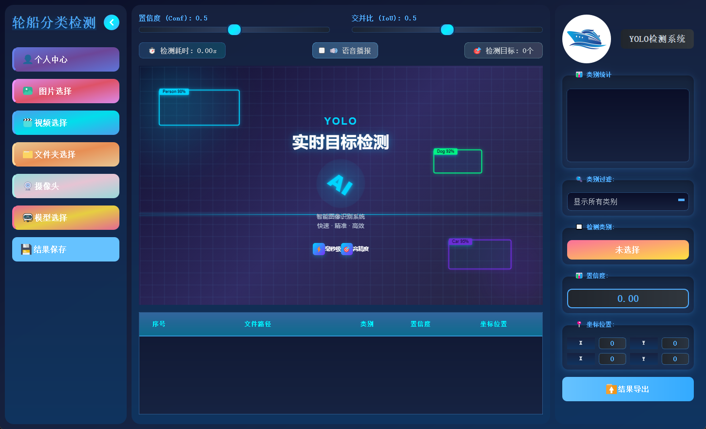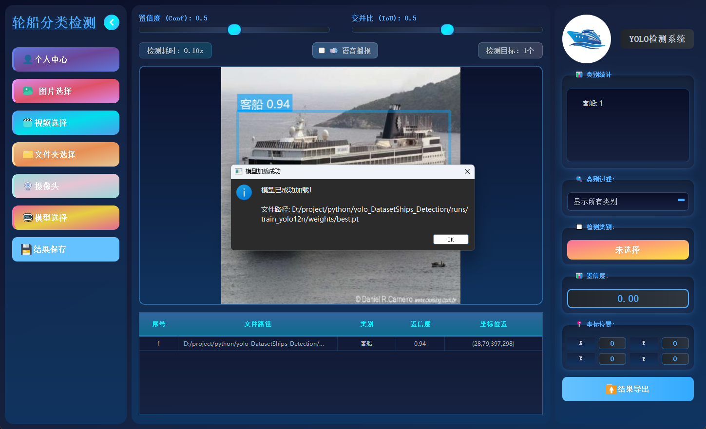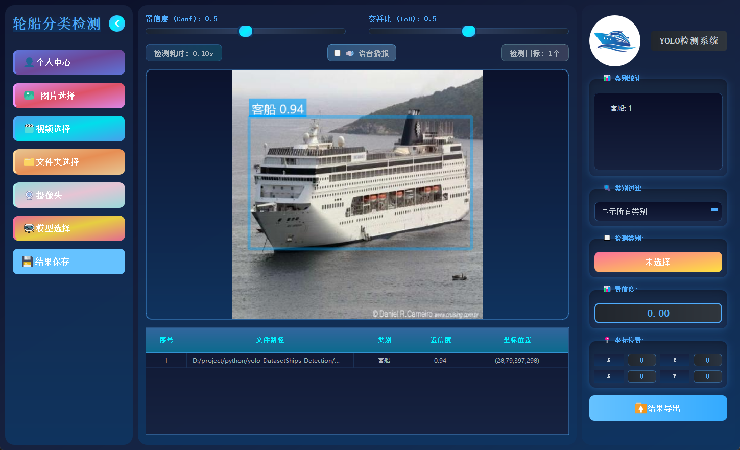 本文设计并实现了一套 基于 YOLO 算法的轮船分类检测系统,能够对图片、视频以及摄像头实时视频流中的多种船舶类别进行检测与分类,并输出类别标签、置信度与位置信息。