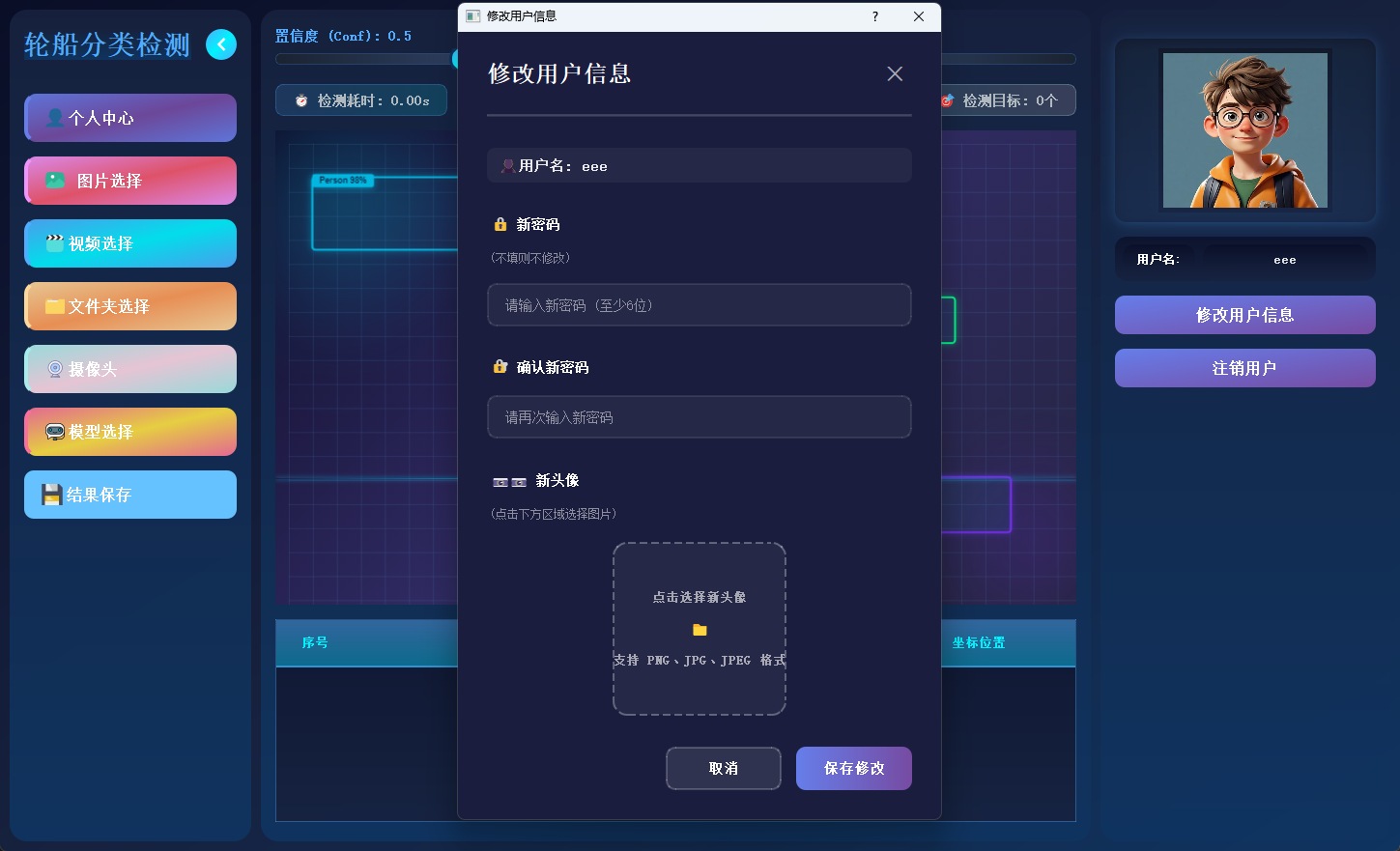 用户可在此模块中修改密码或更换头像,个人信息支持随时更新与保存。