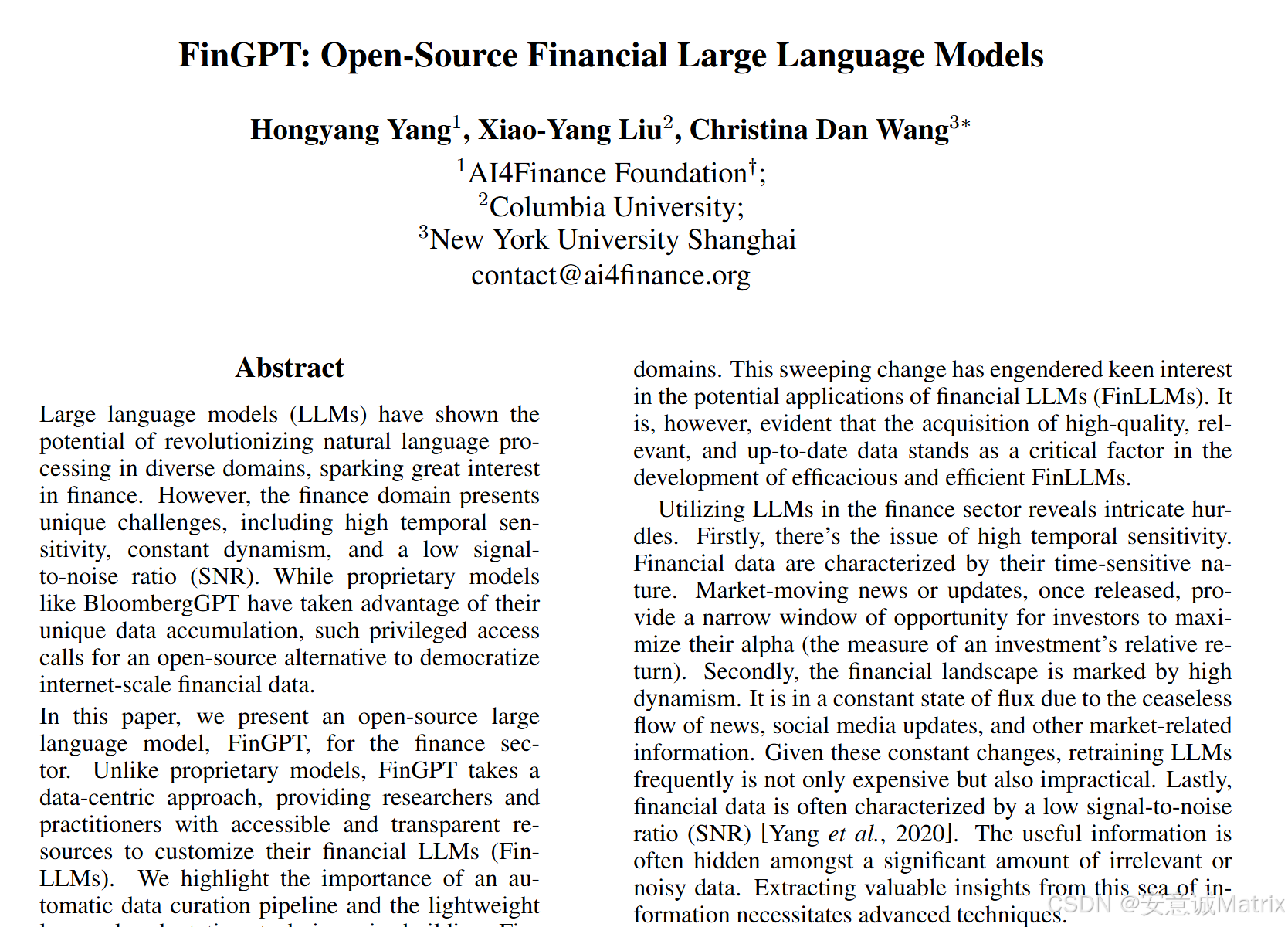 本文提出FinGPT ------一款由AI4Finance Foundation主导开发的开源金融大语言模型(FinLLMs),旨在解决金融领域高时间敏感性、高动态性、低信噪比(SNR) 的核心挑战。与BloombergGPT等专有模型(训练成本约 300万** )不同,FinGPT以**数据中心approach** 为核心,构建包含数据来源层、数据工程层、LLMs层、任务层、应用层的端到端框架,通过**Low-rank Adaptation(LoRA)** 轻量级微调(单次成本约 **300 ,可训练参数仅8.3M )、Reinforcement Learning on Stock Prices(RLSP) 及Retrieval Augmented Generation(RAG) 优化模型性能,在金融情感分析任务中以82.1%的准确率 超越FinBERT、ChatGPT等基线模型,最终目标是民主化金融数据与FinLLMs,并通过开源社区(代码仓库:https://github.com/AI4Finance-Foundation/FinGPT、https://github.com/AI4Finance-Foundation/FinNLP)推动开放金融的创新与协作。