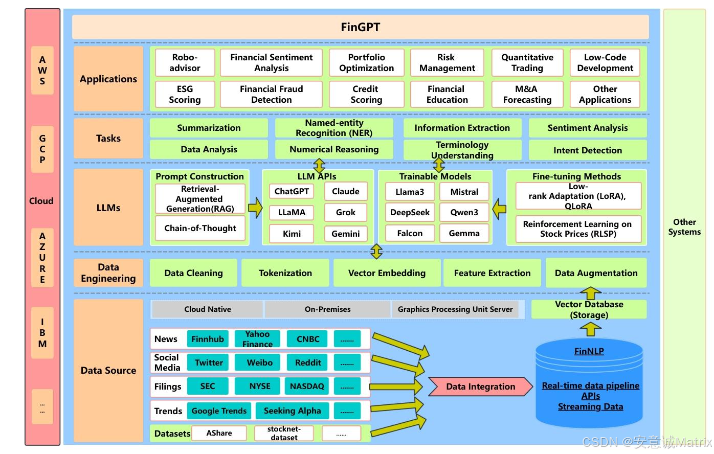 - 民主化FinLLMs:开源代码(仓库:https://github.com/AI4Finance-Foundation/FinGPT、https://github.com/AI4Finance-Foundation/FinNLP)与数据,允许用户基于私有数据微调,适配个性化需求。