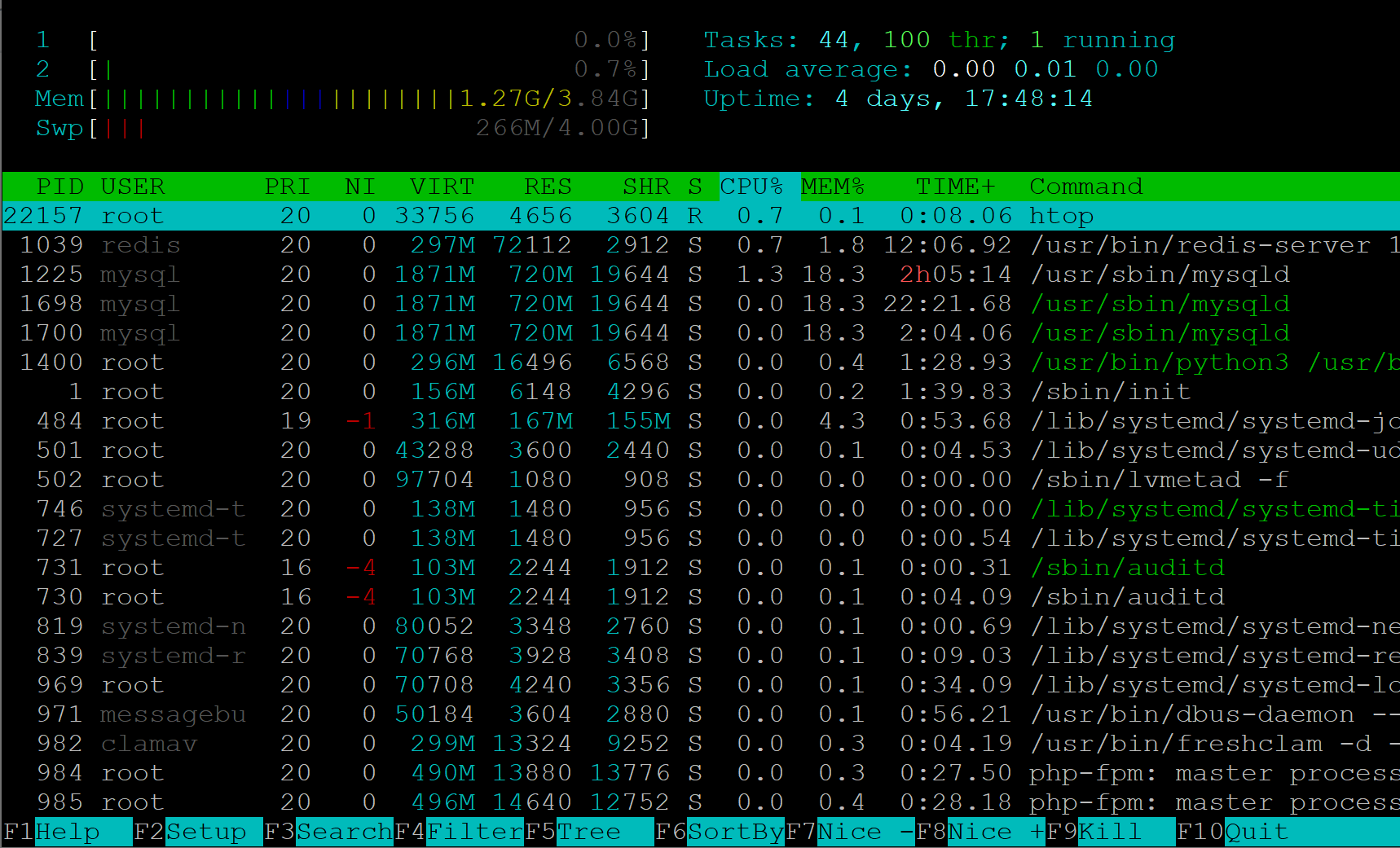 gunicornCPU 占用高达 132.8%(多线程/多核叠加) mysqld内存占用也不小