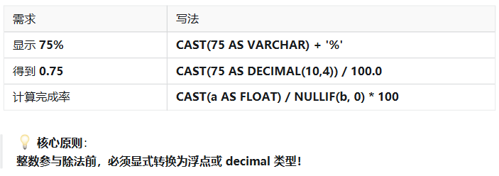 CAST(CAST(@completed AS FLOAT) / NULLIF(@total, 0) * 100 AS VARCHAR) + '%' AS 百分比字符串; -- '75%'