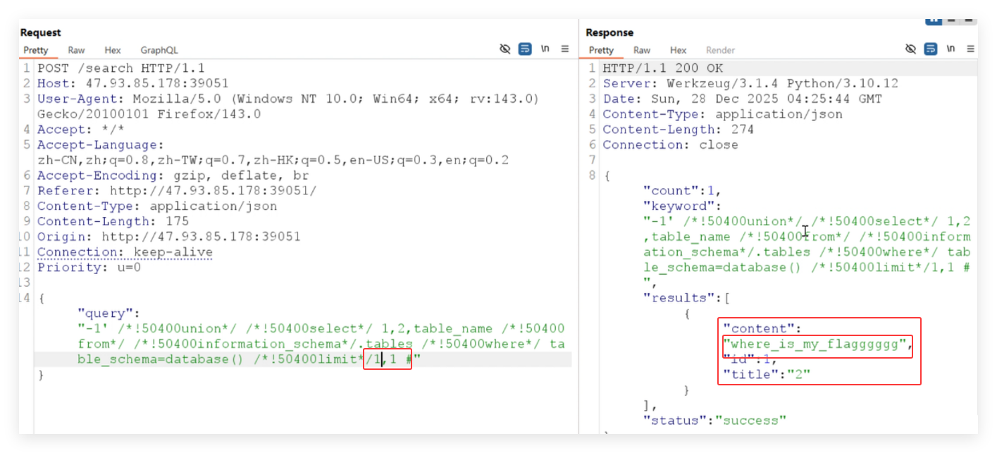注意这里不能使用group_concat(table_name)而是用limit,被过滤掉了,当时在卡在这里试了好久。得到两个表明article、where_is_my_flagggggg