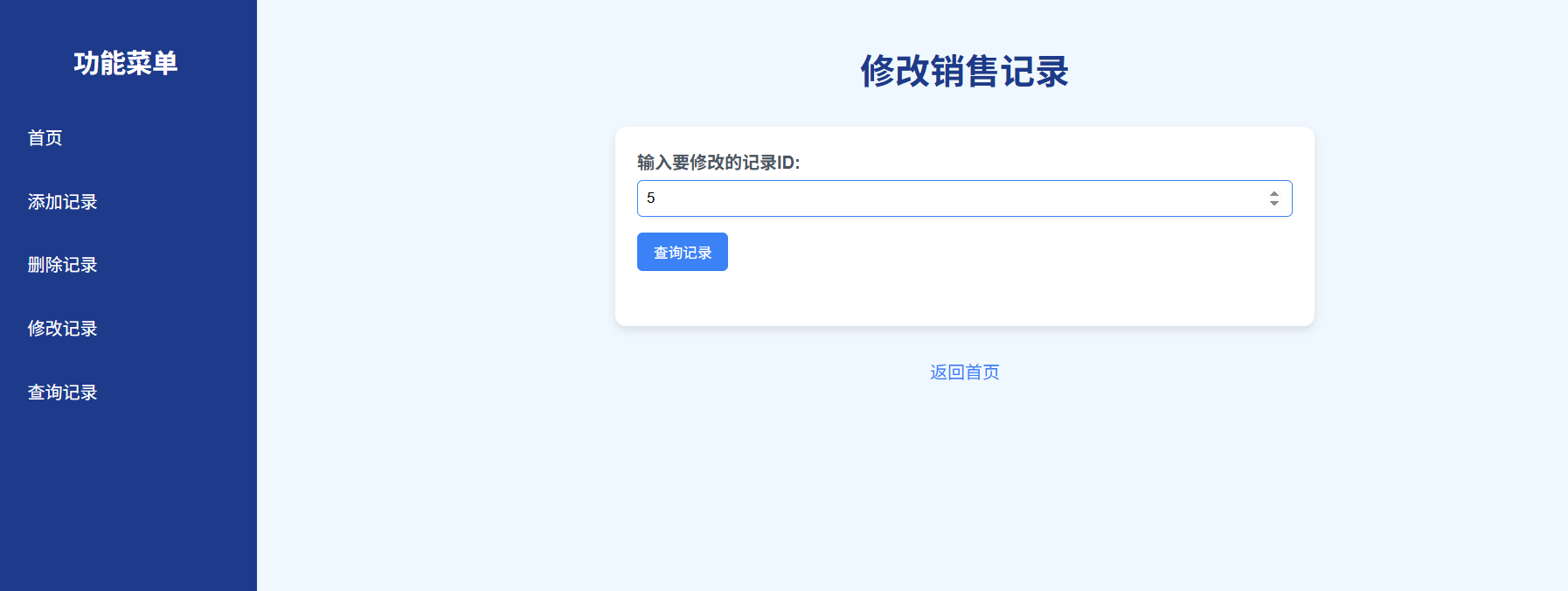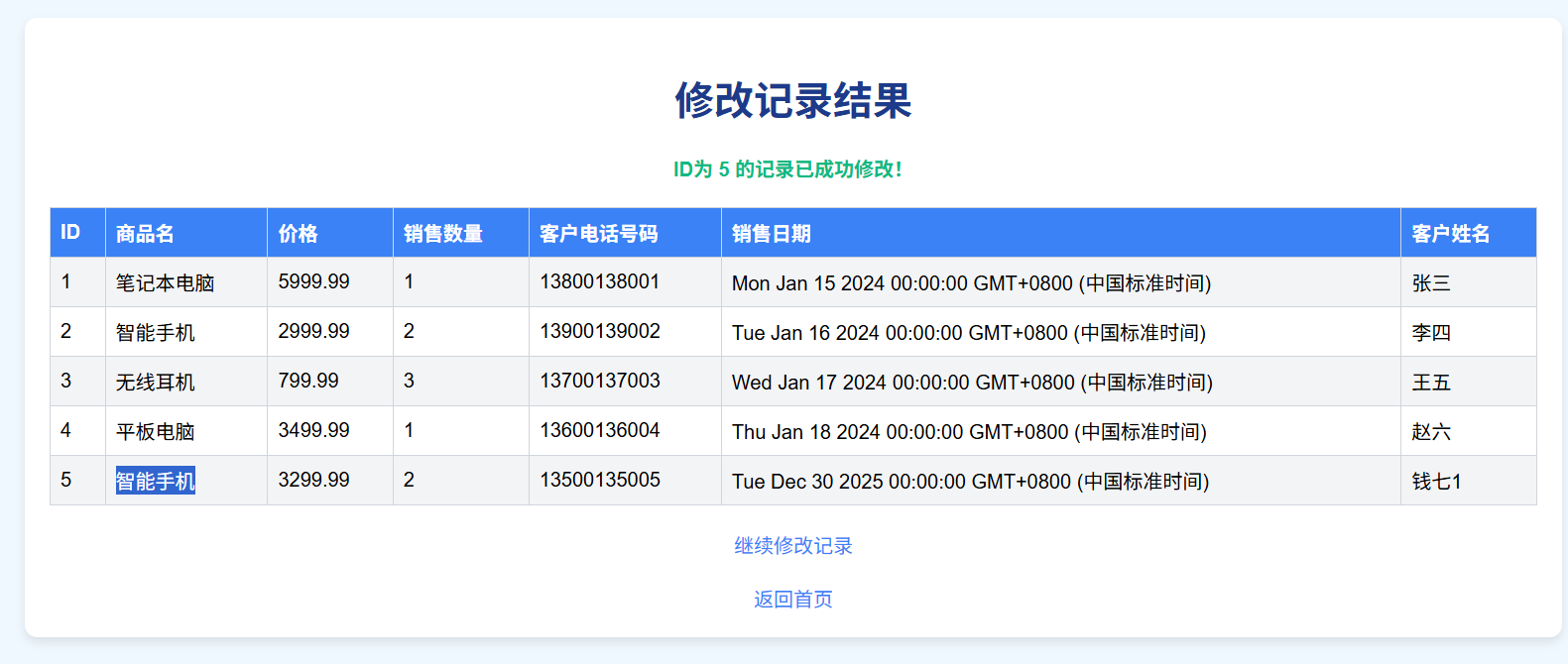 | 修改记录 | 首页→修改销售记录→输入 ID + 要修改的字段→提交 | 记录修改成功,页面显示更新后所有记录表格 |