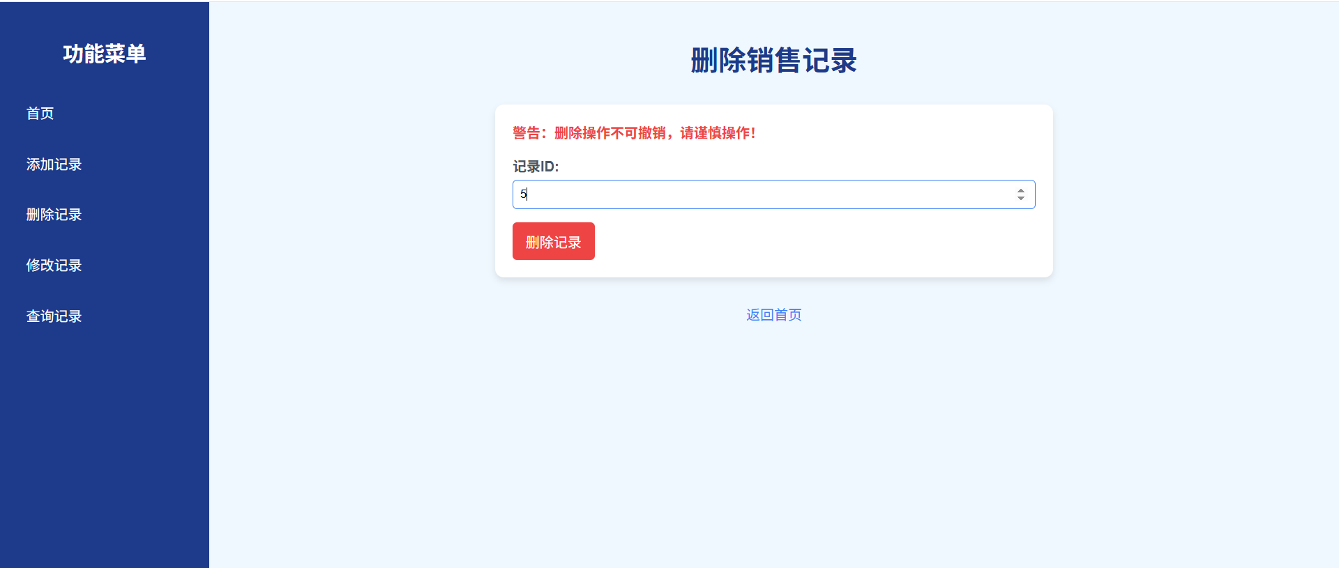 | 删除记录 | 首页→删除销售记录→输入存在的 ID→提交 | 记录删除成功,页面显示剩余记录表格 |