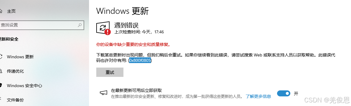 相信很多小伙儿在使用win10过程中遇到系统更新失败,报错:0x800f0805 你的设备中缺少重要的安全和质量修复;但是手动安装更新时,又提示不支持,尝试很多方法,终不管用,但是公司又要求合规审计,电脑系统必须要升级到最新更新。这里记录微软社区支持专家提供的解决方案及现场验证效果。