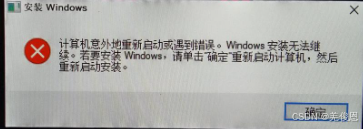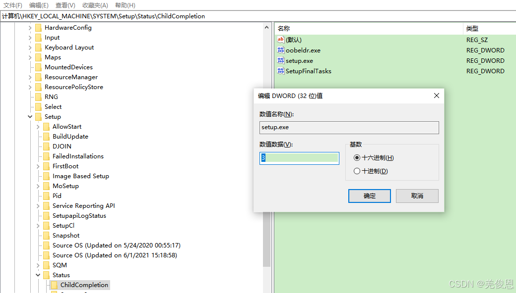 如果你遇到如下错误,可按Shift+F10调出命令行,输入regedit,按回车键,找到如下注册表位置,恢复setup值为3后重启