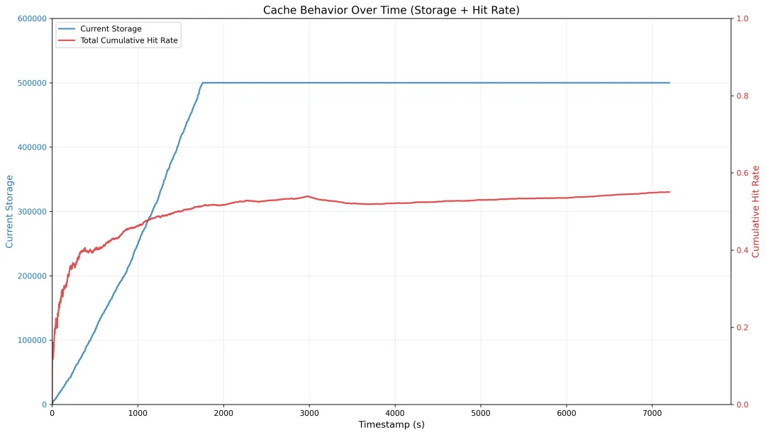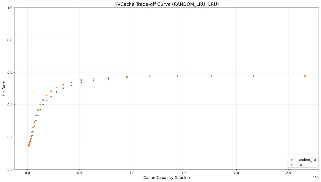 通过统一的 Trace 数据结构和高效的 Trace 处理机制,Optimizer 模块能够准确还原真实业务场景下的缓存行为,提供稳定且快速的性能分析。效果如图所示,图1的动态分析能够实时追踪缓存容量使用与命中率的协同变化;而图2清晰描绘了不同驱逐策略在不同缓存容量配置下的 KVCache 命中率收益,从而测试不同驱逐策略的性能变化以及指导最优容量配置。
