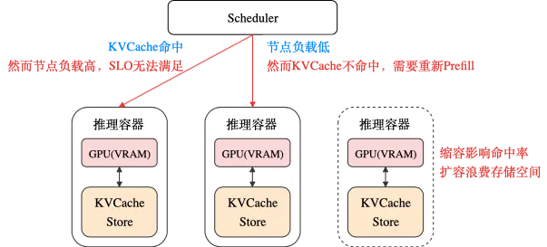以上几点导致传统模式下调度难度不断增大,KVCache命中率和算力SLO调度目标的冲突日益尖锐。例如当请求量升高时,调度器需要进行更多的会话迁移以保证SLO,进而导致 KVCache 命中率下降;这又会进一步推高 Prefill 算力需求,导致Prefill负载非线性增长甚至雪崩。
