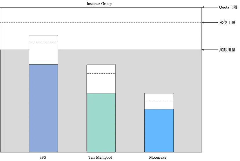 - Instance Group可配置一个总Quota,以及针对每种存储类型配置一个Quota。例如:总Quota = 100T,TairMemPool Quota = 1T,3FS Quota = 99T。