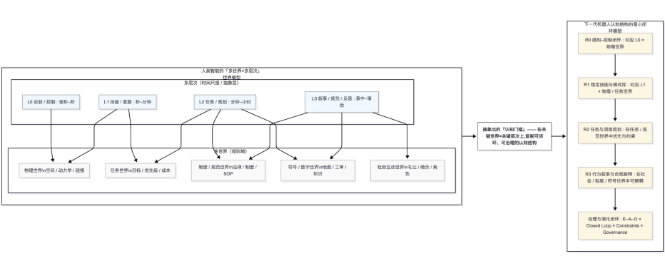 人类多世界×多层次的认知结构,就是对"什么样的机器人才算能在真实社会长期运行"给出的下限: 至少要能在若干关键世界和关键层次上,复制出可治理的闭环。