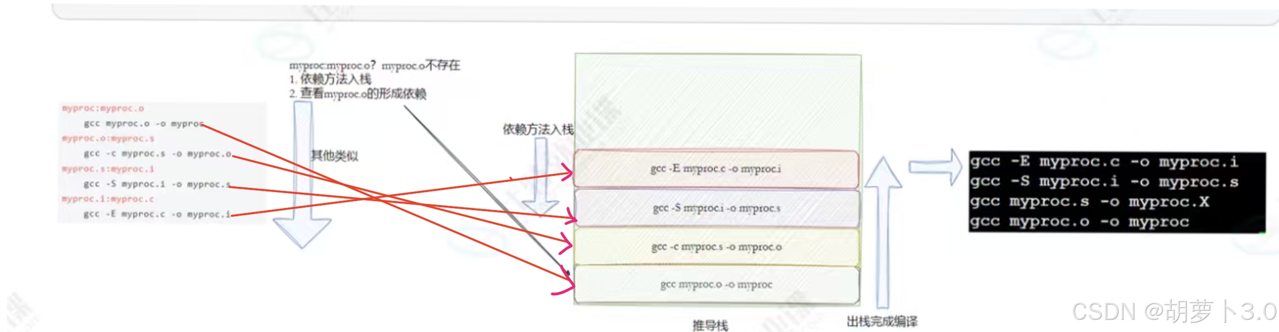- 依赖(prerequisites):生成目标所需要的文件或条件(如生成myproc依赖myproc.c);