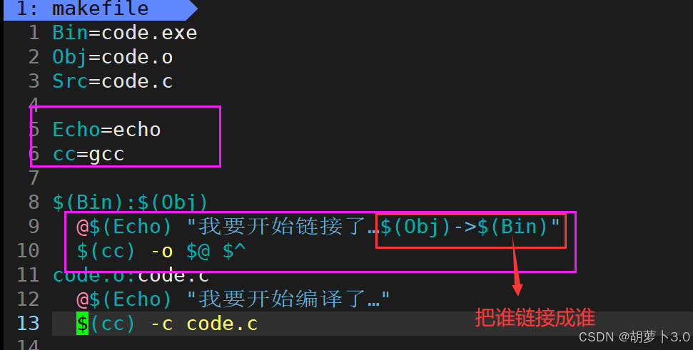 - 当我们在命令行中输入:make,它会自动的给我链接一个code的可执行程序;