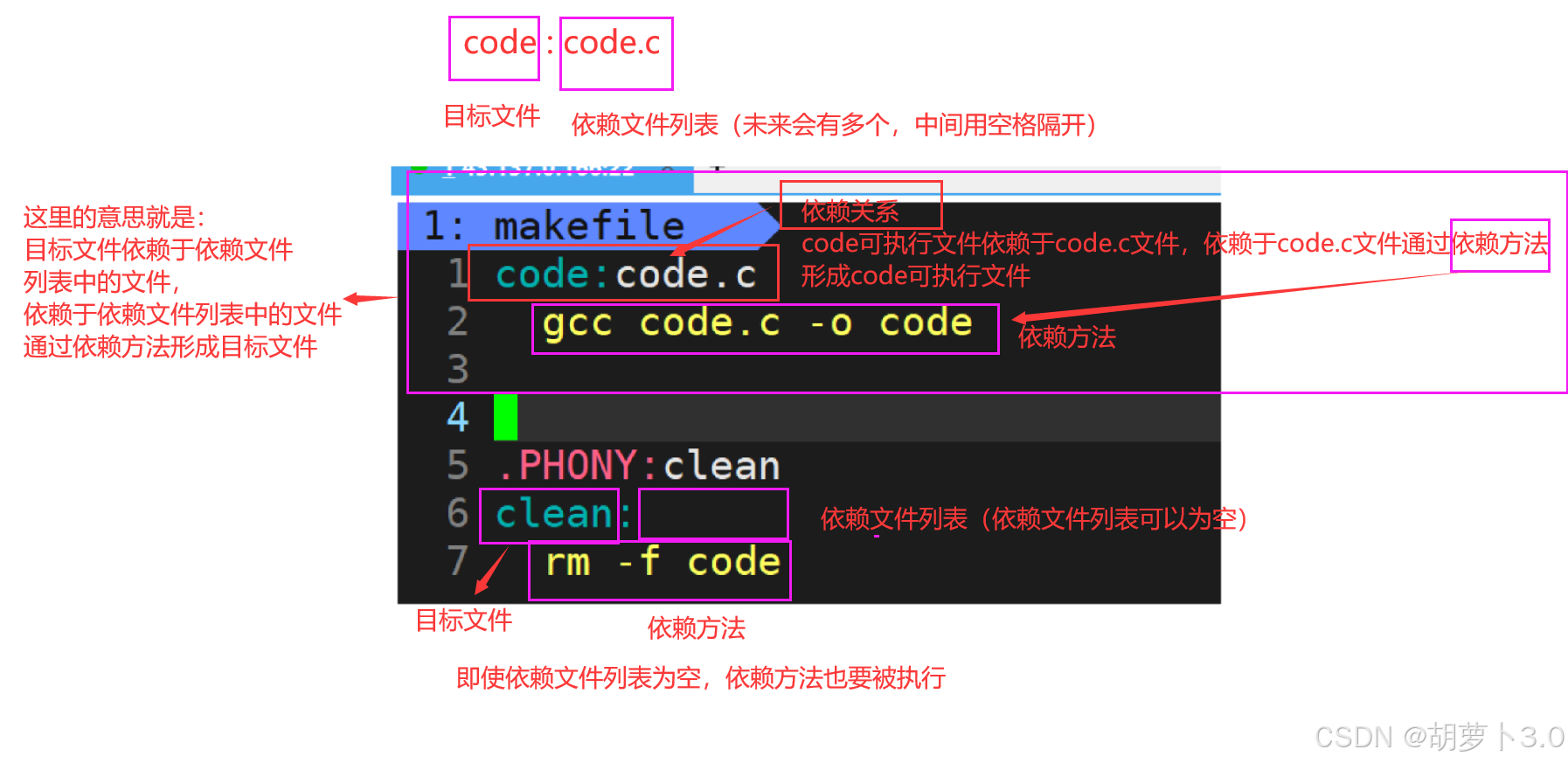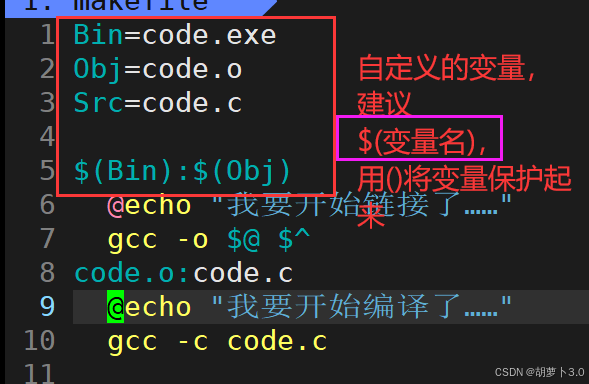 - 命令(command):生成目标的具体操作(如gcc -o myproc myproc.c),必须以 Tab 键开头