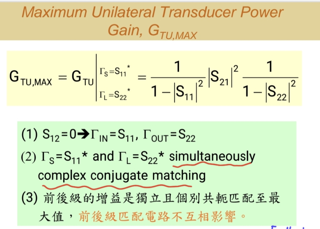 - 最大增益 :类似的,当前后级共轭匹配时,有最大的增益输出GTU,MAXG_{TU,MAX}GTU,MAX