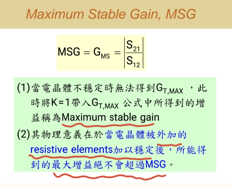 - 当晶体管潜在不稳定(稳定因子 K = 1)时,它能提供的最大增益称为 MSG。
