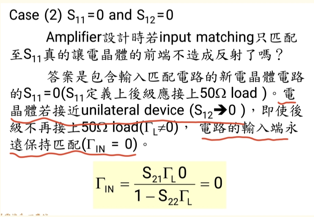 当电晶体为单向器件S12S_{12}S12=0,逆向增益为零,ΓinΓ_{in}Γin公式简化为: