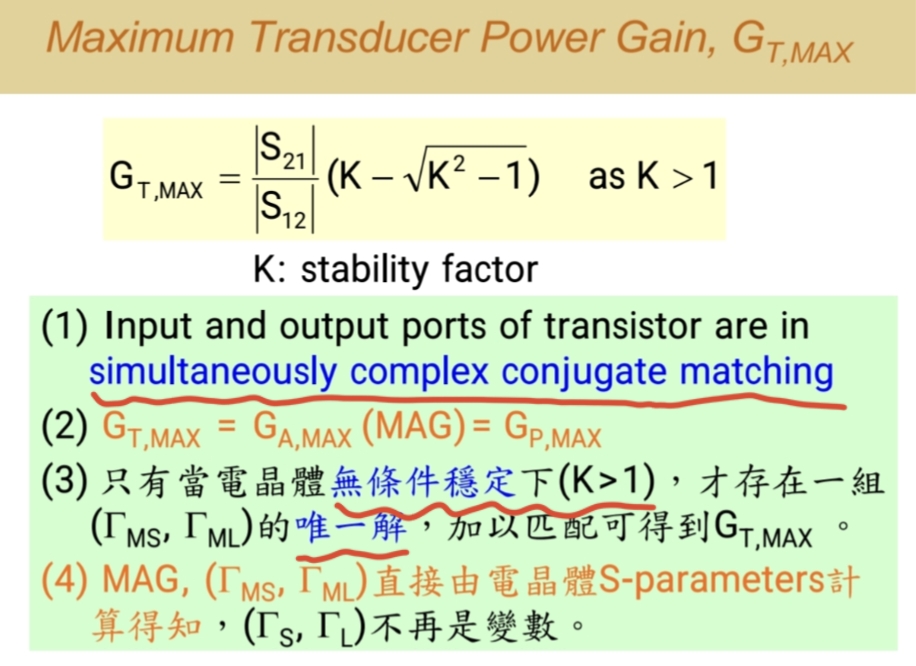 - 当晶体管绝对稳定(稳定因子 K > 1)时,通过共轭匹配能在输入输出端同时获得的最大增益称为 MAG。